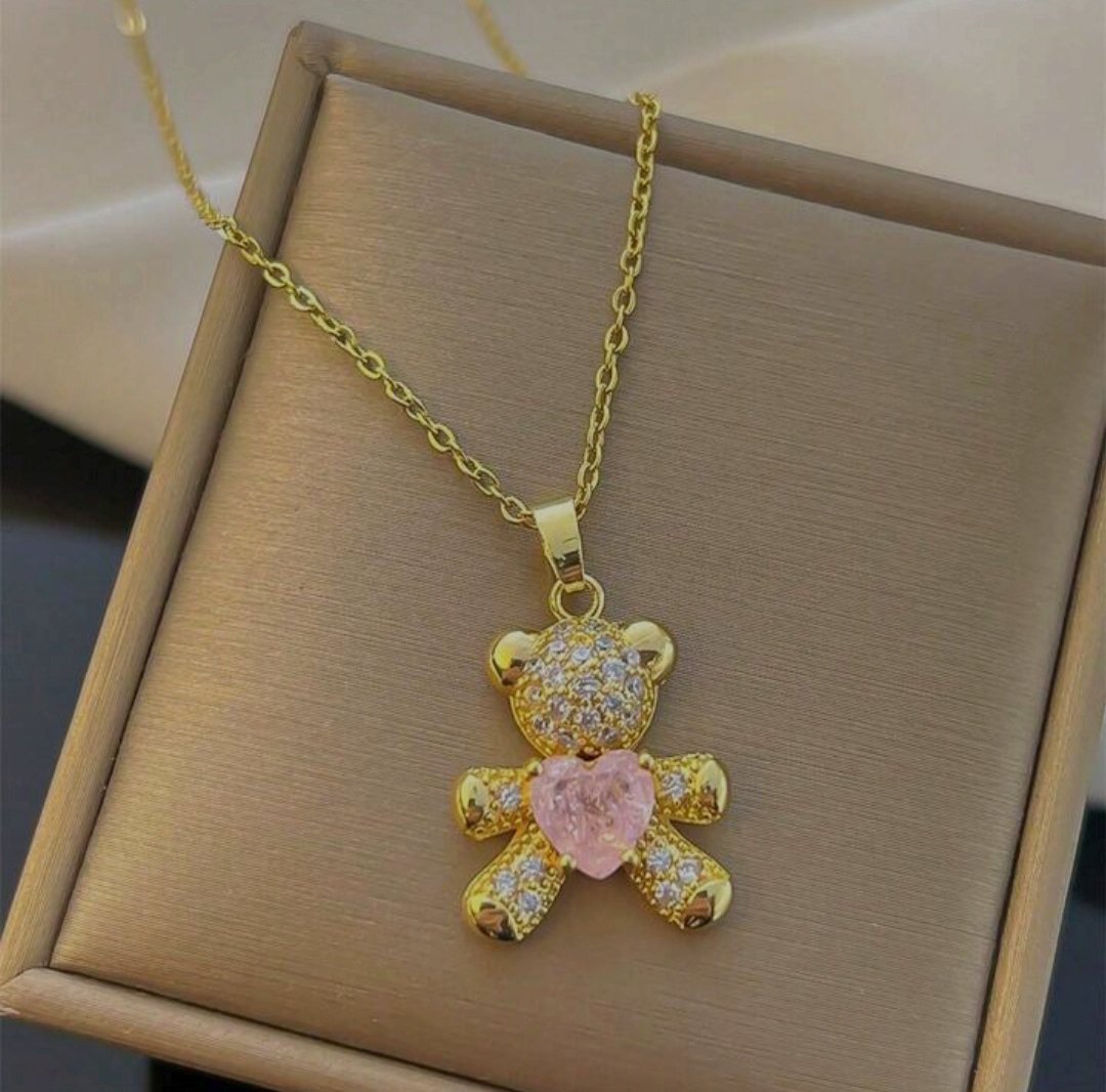 Collar de acero inoxidable chapado en oro 18k, Oso con pancita de de corazón rosa piedra circonita e incrustaciones blancas, cadena estilo labios de 45 cm